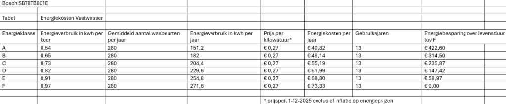 Met een energielabel A hoort deze vaatwasser bij de meest zuinige vaatwassers. Dankzij het High Efficiency Energy Saving System, gebaseerd op Zeolith Droogtechnologie, een innovatieve schuimisolatie en slimme elektronica, scoort deze vaatwasser de allerbeste energieklasse die er is. Zie hieronder je besparing ten opzichte van een vaatwasser met het laagste energielabel F. Meer informatie over de Bosch SBT8TB801E vind je op de website van Bosch.
